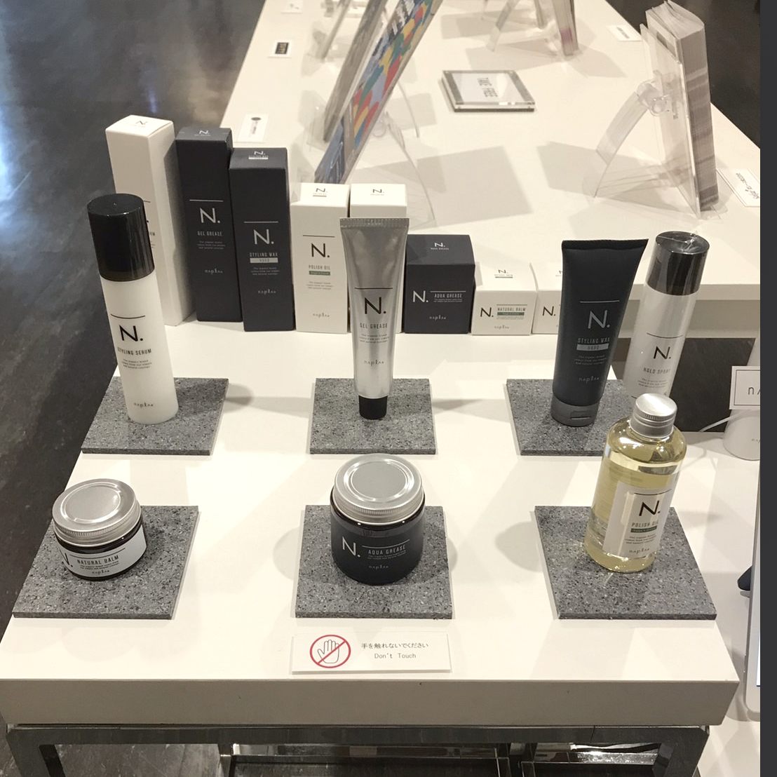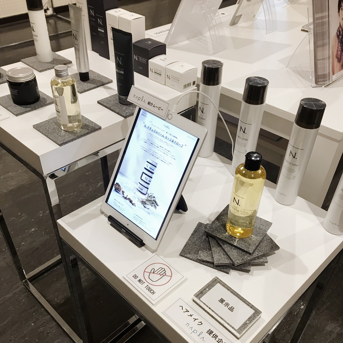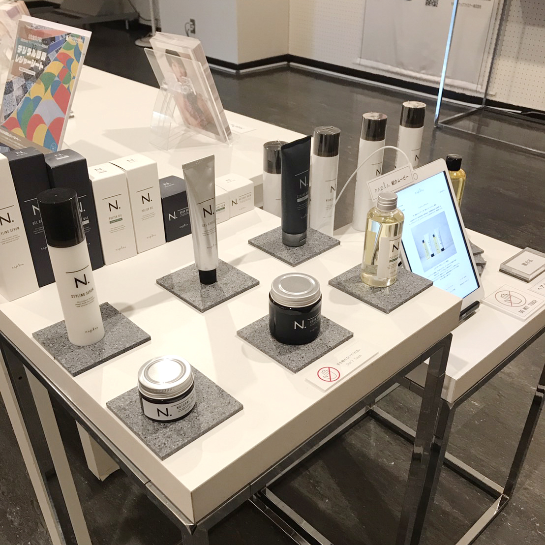 今回、テキスタイルギャラリーにて、美容室専売ヘアケア商品を作る株式会社ナプラ様の展示ディスプレイを使用いただきました。