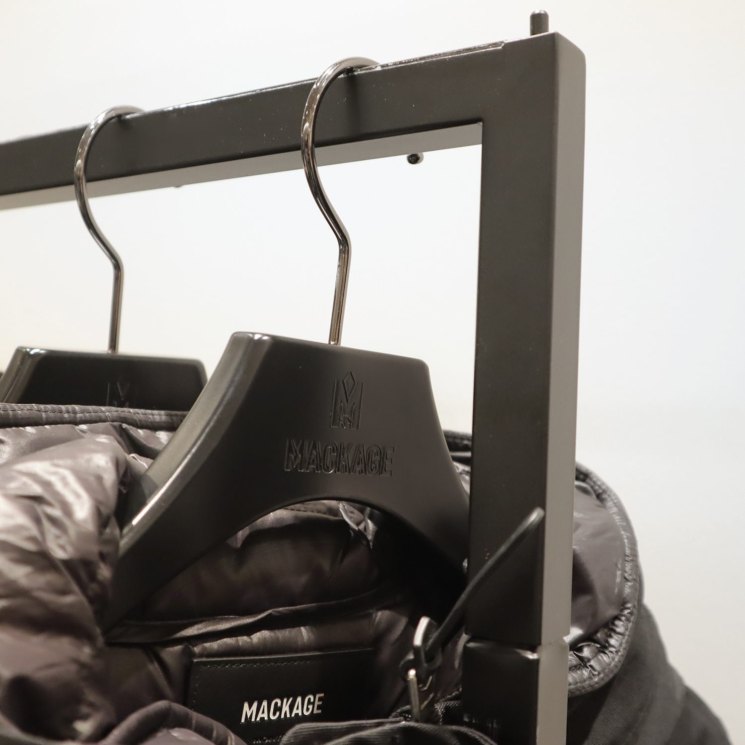 「MACKAGE」様では、艶感のある⿊ベタ塗装にブラックニッケルのフックを取り付け⾼級感のあるデザインに。