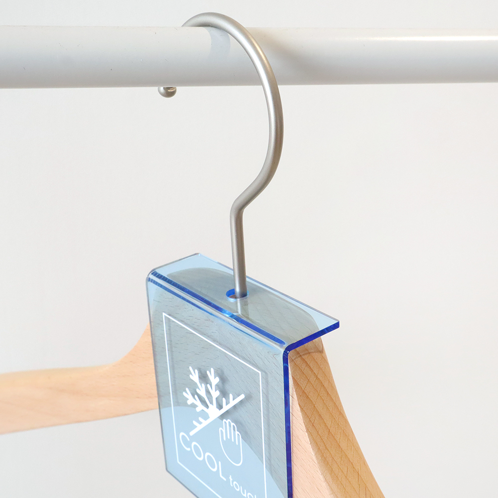 ハンガーひとつひとつに簡単に取り付けられるので、細かく差別化した打ち出しができるのも魅力です。