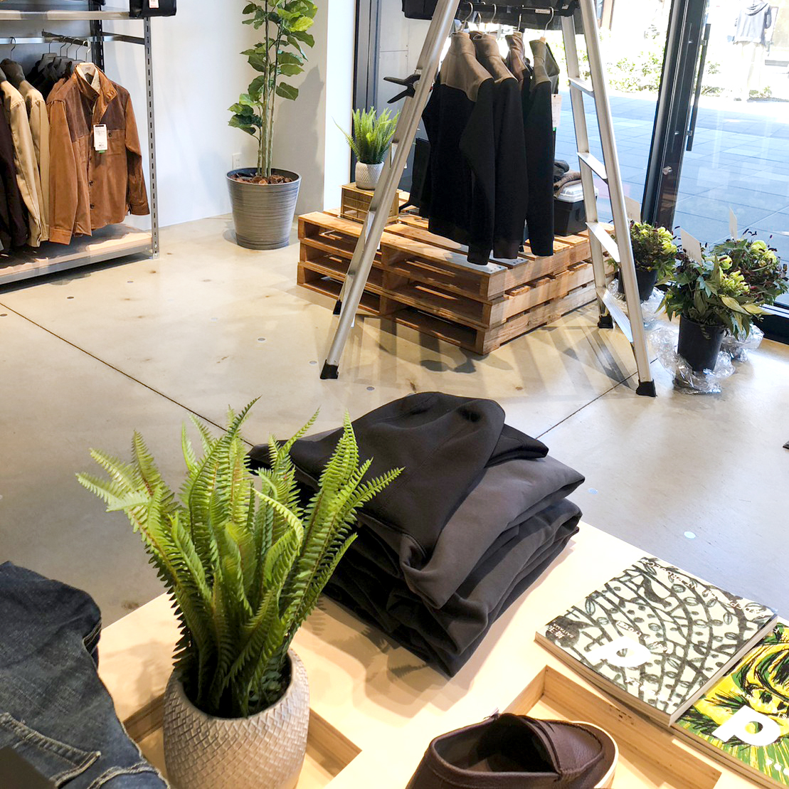 店内は配管が張り巡らされたスケルトン天井が目を引く素敵な空間。 奥には広めのシッティングスペースがあり、広いモールでのショッピングの休憩に、お子様やお連れ様の御待ちのお時間に、フリースペースとしてお寛ぎいただけます。 他にもグリーンや、書籍、額層された写真など、店内を彩る素敵なディスプレイなど。 是非その空間をお楽しみいただければと思います。