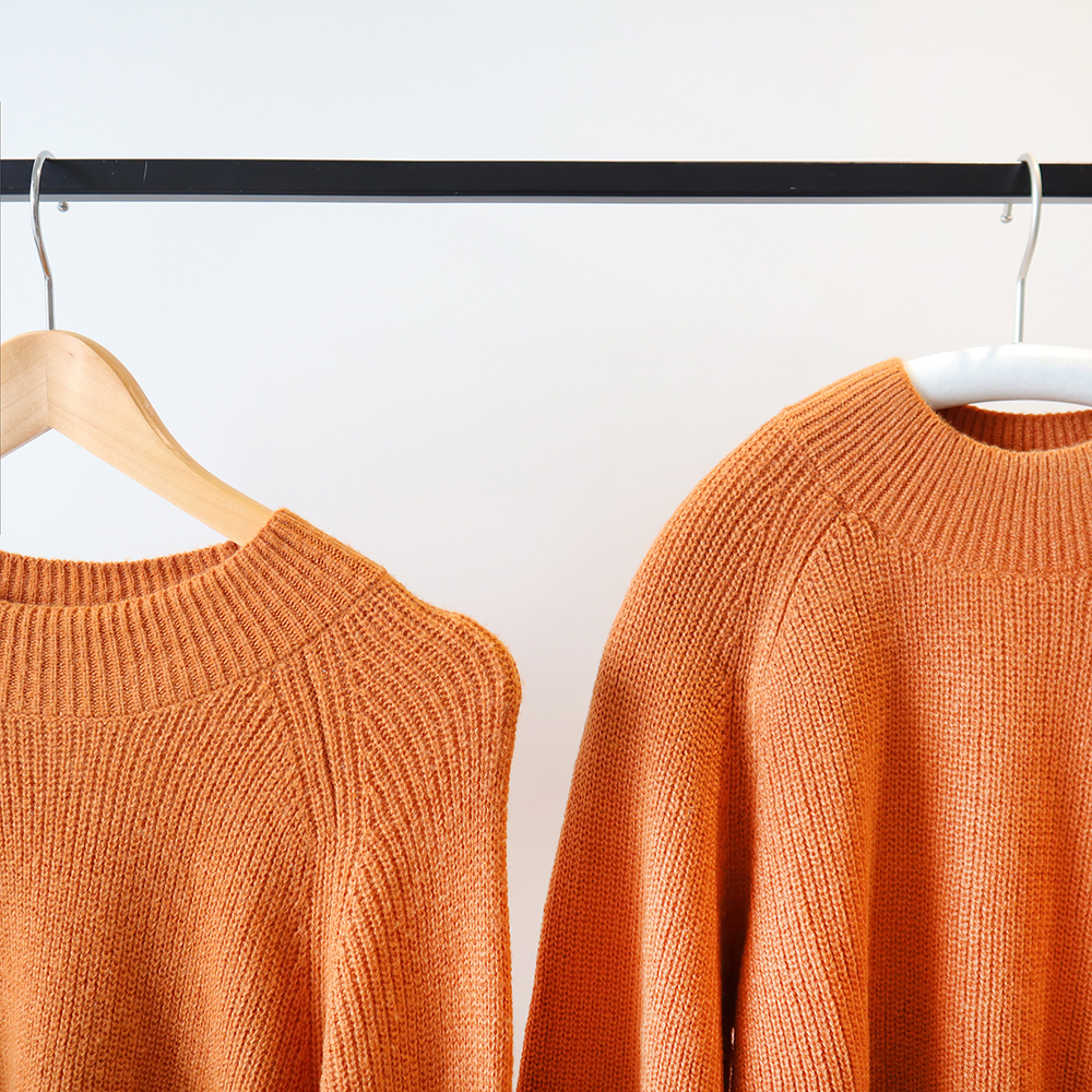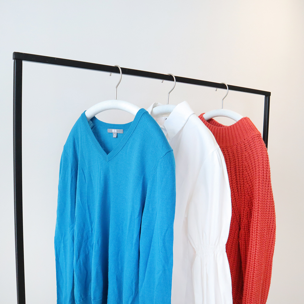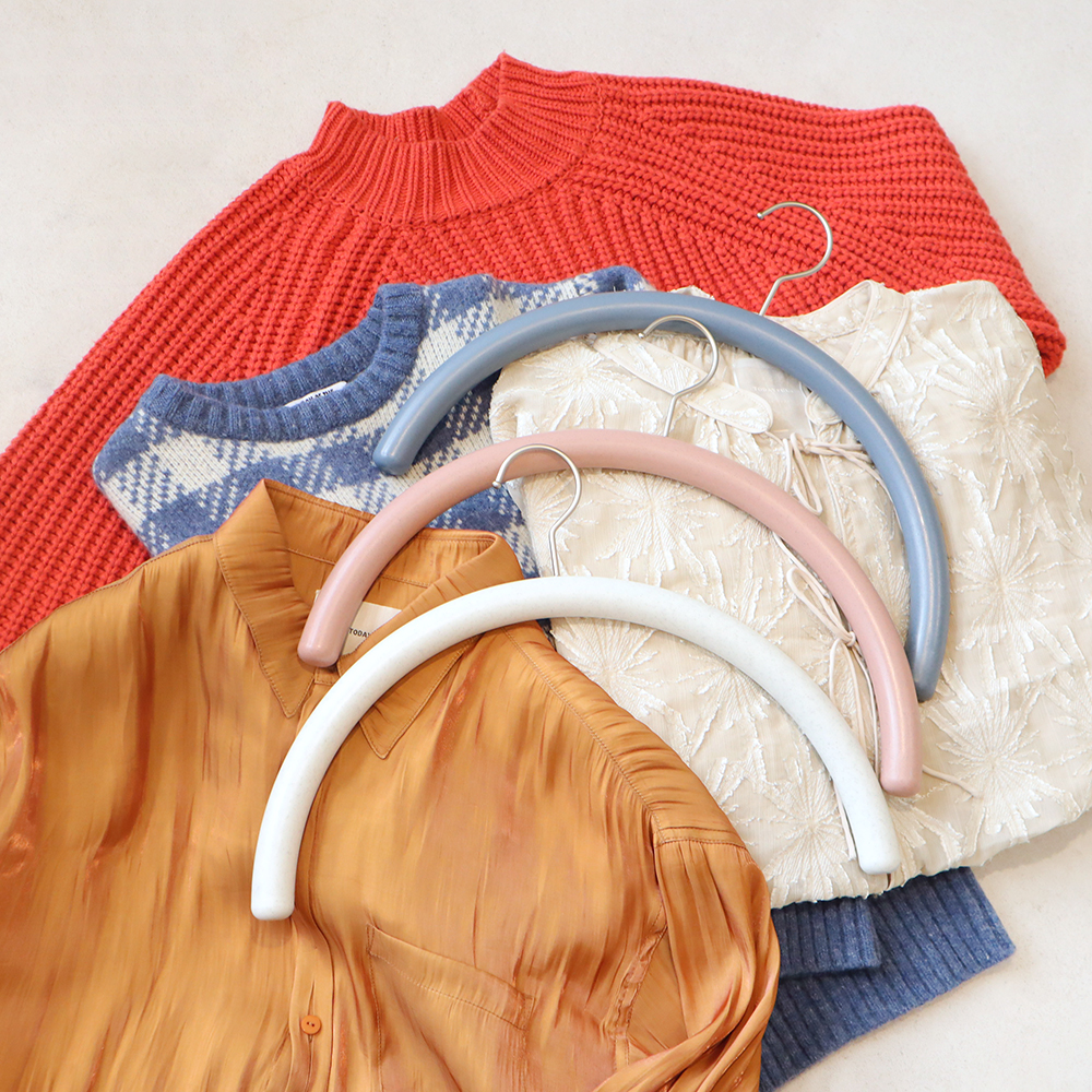 また、畳んでしまうと引き出しがすぐいっぱいになってしまうニット製品も、吊るして収納。省スペースがで実現できる便利な収納グッズとしてもお使いいただけます。
