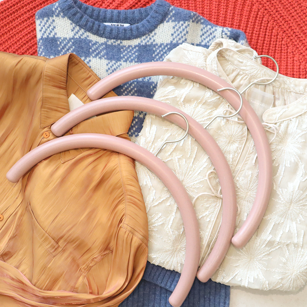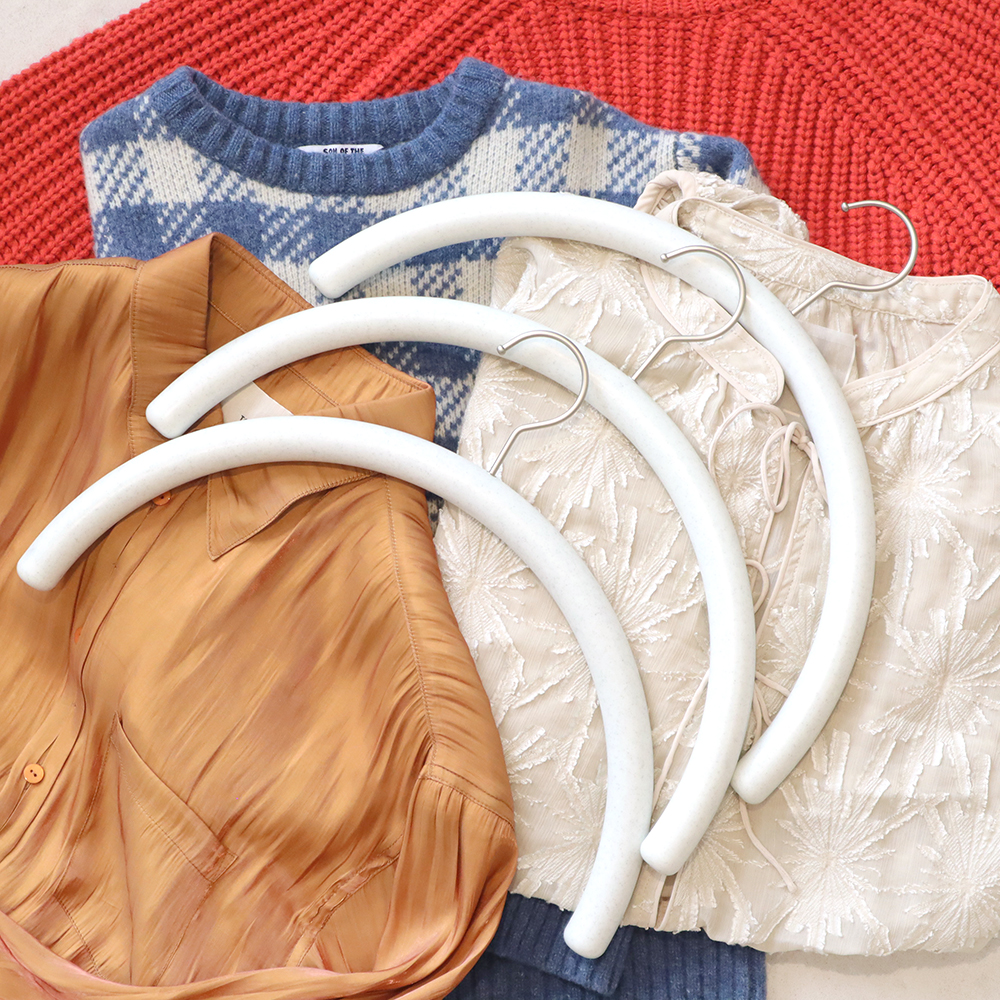 このアーチ状のカタチは見た目が可愛いだけでなく、ニットやオーバーサイズTシャツなど、伸びやすいお洋服に最適な肩に跡がつかない形状で、型くずれ防止効果があります。